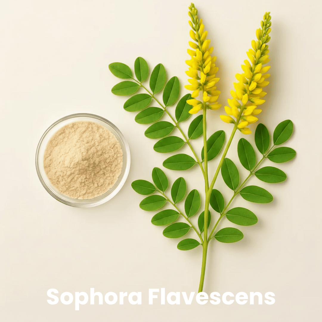 Sophora Flavescens ist eine asiatische Heilwurzel, reich an Flavonoiden. Sie wirkt antibakteriell und bringt die Talgproduktion ins Gleichgewicht – ein entscheidender Faktor, da der Malassezia-Pilz sich von Hautfetten ernährt.